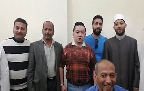 أشهر شابّ صيني الجنسية إسلامه، في مصر عقب صلاة الجمعة الماضية، في مسجد الميناء الكبير بالغردقة.