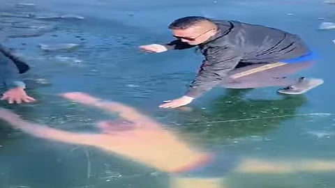 كاد سباح أن يفقد حياته داخل بحيرة متجمدة، بعدما علق تحت الجليد، وسط محاولات من زملائه لإنقاذه من الغرق.