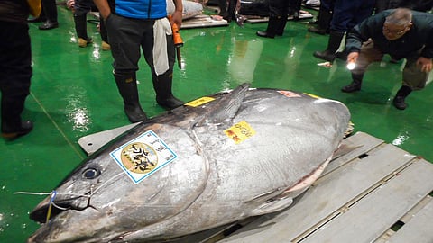 بيعت سمكة تونة ضخمة زرقاء الزعانف مقابل 8.20 مليون ين «202 ألف دولار» في طوكيو اليوم الثلاثاء، في أول مزاد هذا العام في سوق السمك الرئيسية بالمدينة.