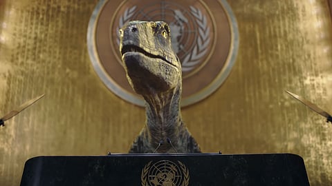 اقتحم «ديناصور» قاعة الجمعية العامة للأمم المتحدة بنيويورك؛ للإدلاء بشهادته حول مخاطر حرق الوقود الأحفوري، وتسببه في تفاقم ظاهرة الاحتباس الحراري.