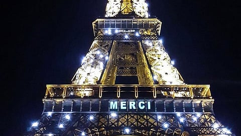 أضاء برج «إيفل» في باريس، أمس الجمعة، بكلمة «شكرًا»، تحية للأطقم الطبية والعاملين في قطاع الخدمات الأساسية، الذين يواجهون فيروس كورونا المستجد (كوفيد-19).