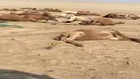 ويظهر في مقطع الفيديو عشرات الإبل النافقة في وسط الصحراء؛ حيث أكد المغردون أن السبب وراء نفوق الإبل هو تناولها لبعض النباتات السامة.