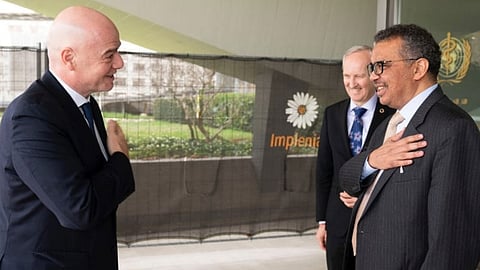 أعرب الدكتور تيدروس أدهانوم غيبرييسوس، مدير منظمة الصحة العالمية عن امتنانه لجياني إنفانتينو رئيس الاتحاد الدولي لكرة القدم (فيفا)؛ لالتزامه بتوفير الدعم للمنظمة، والعالم، من خلال كرة القدم، لمواجهة تفشي فيروس كورونا الوبائي.