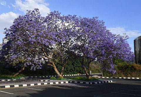 أضفت أكثر من 13 ألف شجرة «جاكرندا» طيفًا زاهيًا على جمال الطبيعة في مدينة أبها؛ فمع حلول فصل الربيع، ولمدة 8 أسابيع، تكسو الأغصان الكثيفة أزهار بنفسجية وأرجوانية تفوح بشذاها أرجاء المكان.