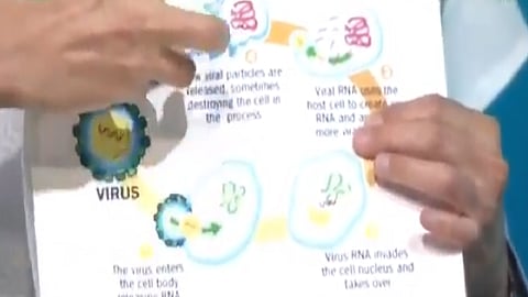 وقال خلال لقائه على قناة السعودية: إذا اقترب الفيروس من خلايا الجدار المخاطي الموجودة في الجهاز التنفسي العلوي والسفلي، يبدأ مهاجمة المادة الحيوية في الخلية (السيتوبلازم)، ومثله مثل غيره من الفيروسات يقوم بالسيطرة على مركز الخلية، ويتحكم فيها كلية (تطيع أمره)، من حيث تكاثره والقضاء عليها نهائيًا، ويبدأ المصاب في السعال والكحة، ويخرج الفيروس مع الرذاذ ليصيب الآخرين.