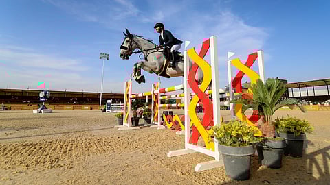 تقدم المشارك الفارس عبدالرحمن النمر (18 عامًا) المتوج بالمركز الأول في الشوط الأول من البطولة الحالية لفئة الـ«نجمة واحدة ـ ارتفاع 1.15 متر».