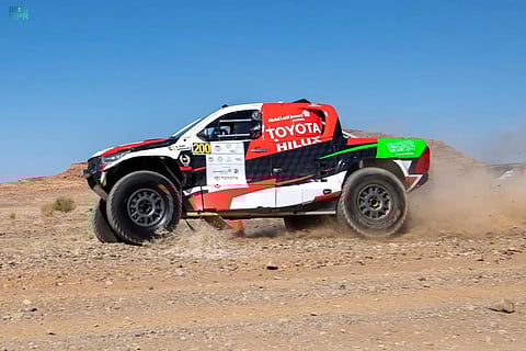 وأنهى "الراجحي" المرحلة بتوقيت 1:58:75 ساعة، في سيارة تويوتا "هايلوكس"، مُجتازًا تضاريس صحراوية متنوعة، دون مواجهة أي مشكلات.