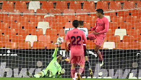 وفي مباراة شهدت احتساب ثلاث ركلات جزاء لمصلحة فالنسيا، بادر الريال بالتسجيل عن طريق نجمه الفرنسي كريم بنزيما في الدقيقة 23، قبل أن يتعادل كارلوس سولر، لفالنسيا في الدقيقة 35 من ركلة جزاء.