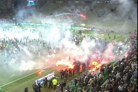 اعتدى جمهور نادي سانت إتيان الفرنسي على لاعبي فريق الكرة الأول بالنادي، بسبب هبوط الفريق إلى دوري الدرجة الثانية الفرنسي، عقب الخسارة أمام أوكسير بركلات الترجيح في ملحق الصعود والهبوط، .