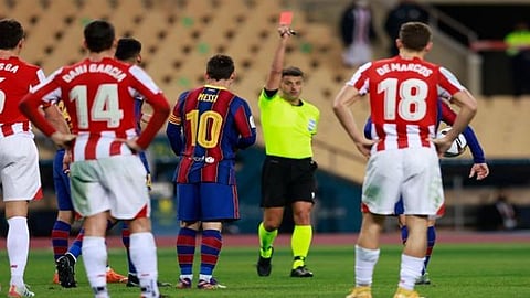 وتلقى ميسي بطاقة حمراء مباشرة، عقب الاعتداء دون كرة على أسيير فيلاليبري لاعب أتلتيك بلباو، خلال مواجهة نهائي كأس السوبر الإسباني، التي انتهت بخسارة برشلونة بنتيجة 2-3.