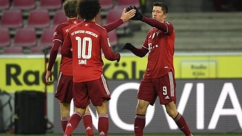 وعلى ملعب راين إينرجي ستاديون، سجل القناص البولندي روبرت ليفاندوفسكي ثلاثة أهداف (هاتريك) ليقود بايرن لفوز عريض على كولن.