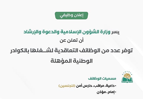 ويتاح التقديم في وظائف وزارة الشؤون الإسلامية طوال فترة التقديم عبر البوابة الإلكترونية من هنا.