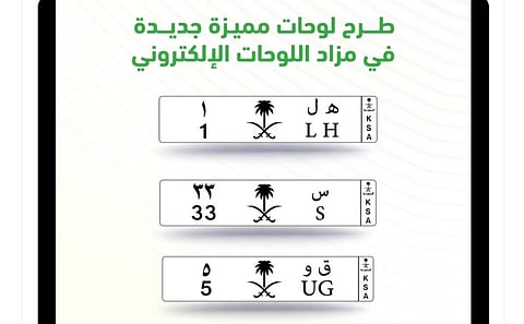 ويتضمن مزاد اللوحات المميزة، لوحات رقم " هـ ل 1" و"س 33" و"ق و 5".