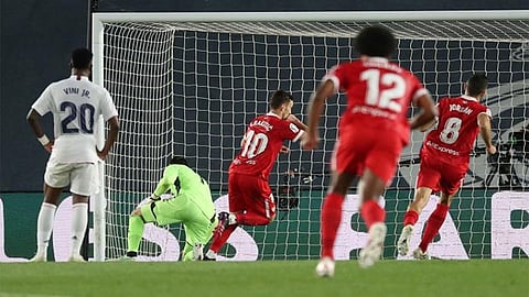 أهدر ريال مدريد فرصة تصدر ترتيب الدوري الإسباني لكرة القدم، وأضاع نقطتين ثمينتين ربما تتسببان في خسارته لقب المسابقة هذا الموسم، عقب تعادله 2 / 2 مع ضيفه إشبيلية الأحد في المرحلة الخامسة والثلاثين للبطولة.