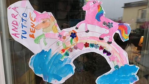 ورسم طفل يبلغ من العمر خمس سنوات، قوس الشمس وعليه شعار «كل شيء سيكون على ما يرام».