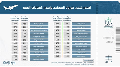 أصدرت جمعية حماية المستهلك، اليوم الخميس، تنويهًا بشأن أسعار فحص كورونا وإصدار شهادات السفر في مدينة الرياض.