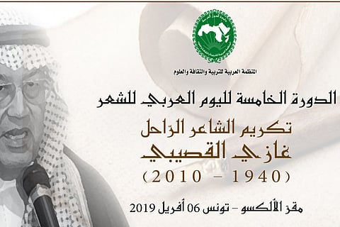 كرّمت المنظمة العربية للتربية والثقافة والعلوم (ألكسو)، اليوم السبت، اسم الشاعر السعودي الراحل غازي عبدالرحمن القصيبي (1940-2010)، ضمن احتفالها بالدورة الخامسة ليوم الشعر العربي 2019م، في مقرها بالعاصمة التونسية.