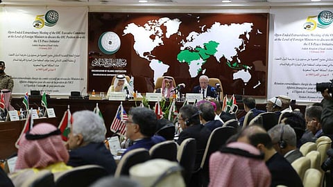 من جانبه، قال الأمين العام لمنظمة التعاون الإسلامي يوسف بن أحمد العثيمين، إن قضية فلسطين تتصدر سلم أولويات المنظمة، مؤكدًا دعم إقامة دولة فلسطينية على حدود 67 وعاصمتها القدس، والتمسك بالحلول المستندة للقرارات الدولية ومبادرة السلام العربية.